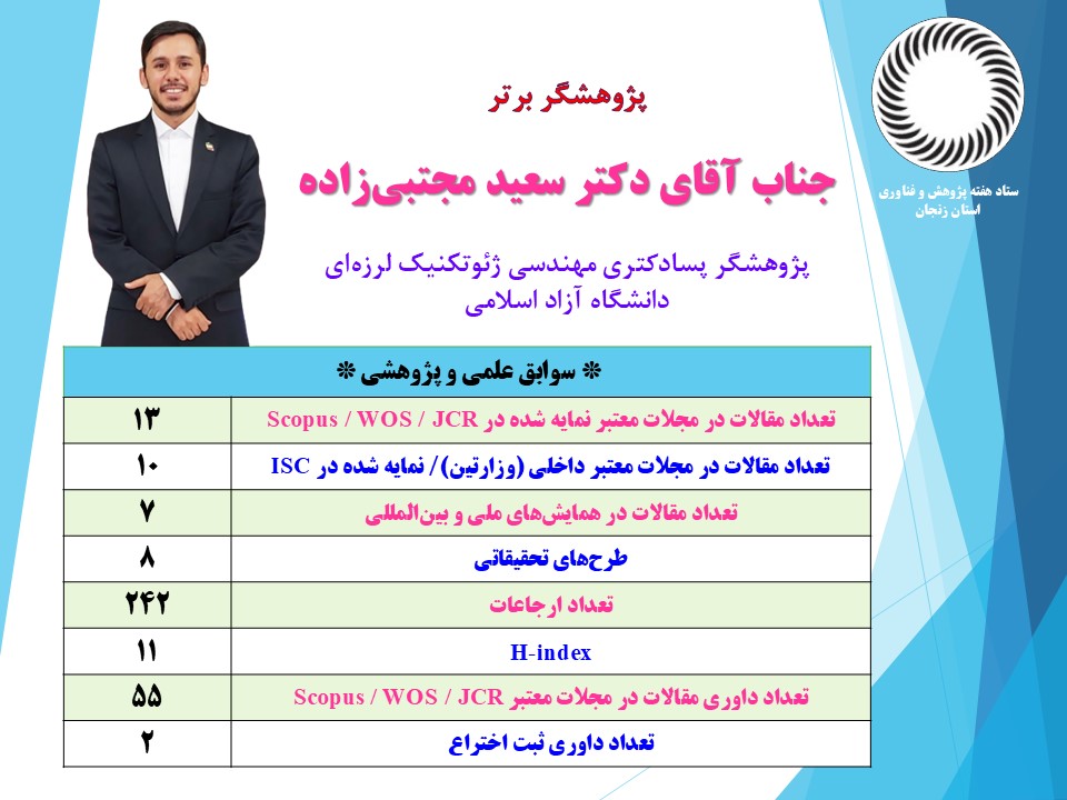 به لطف خدای متعال، به عنوان پژوهشگر برتر استان زنجان انتخاب شدم (هفته پژوهش و فناوری).