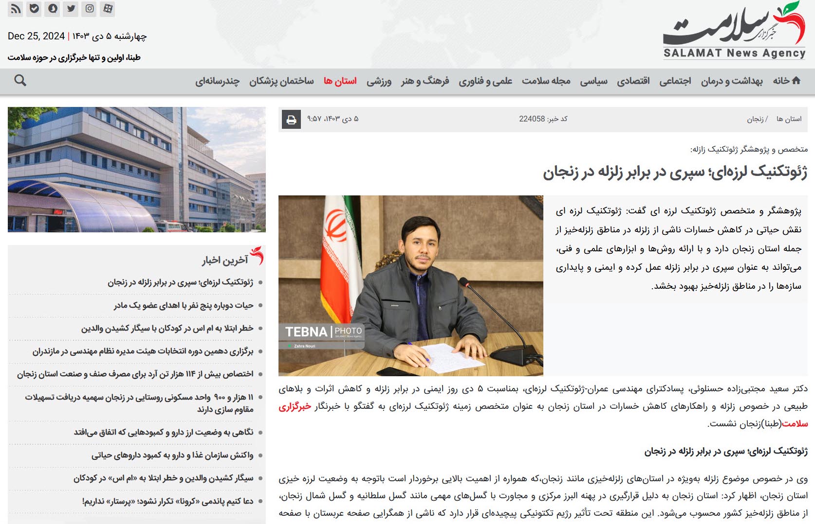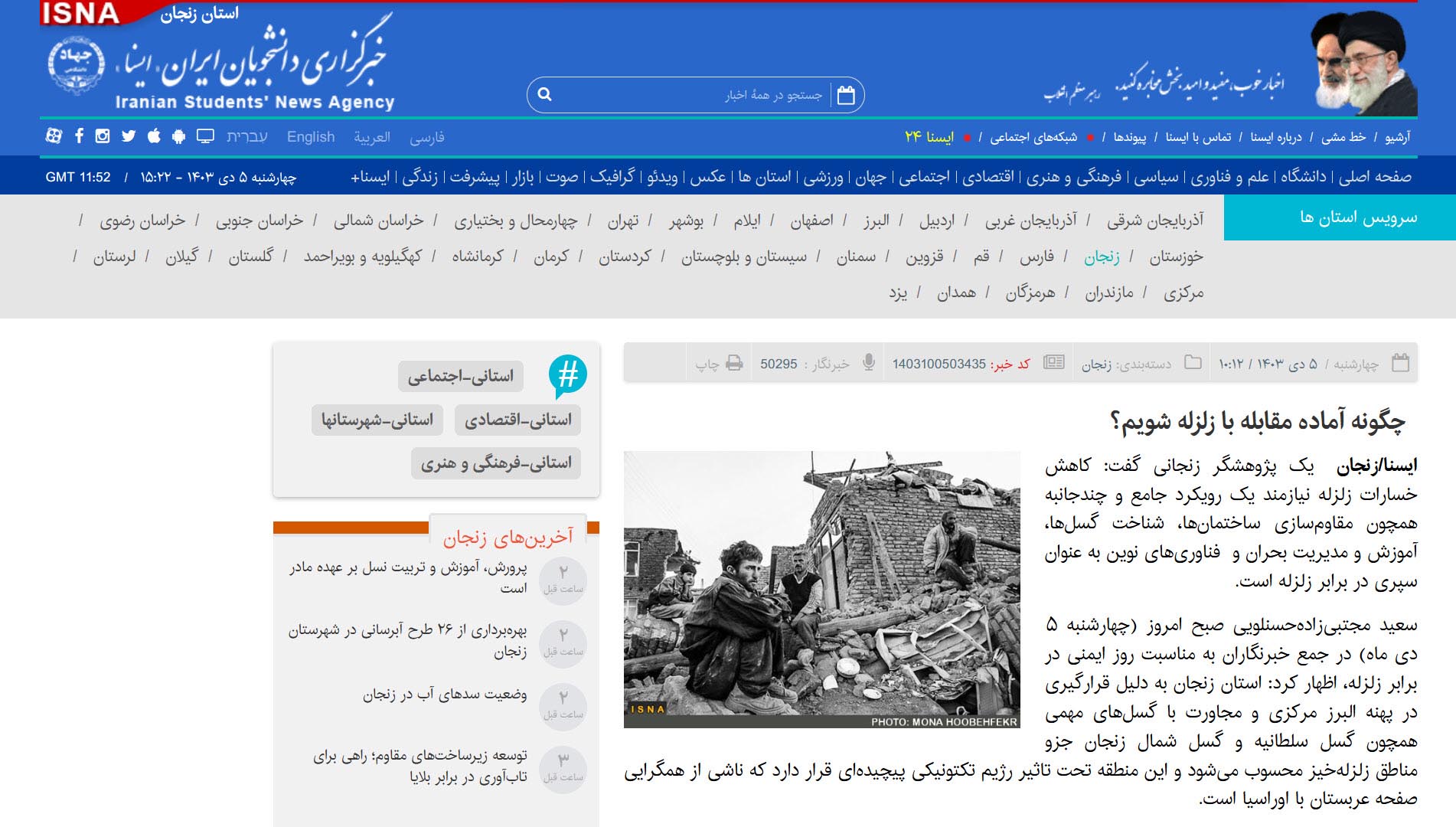 گزارش خبرگزاری سلامت (طبنا) و ایسنا به مناسبت پنجم دی ماه، روز ایمنی در برابر زلزله و کاهش اثرات بلایای طبیعی.