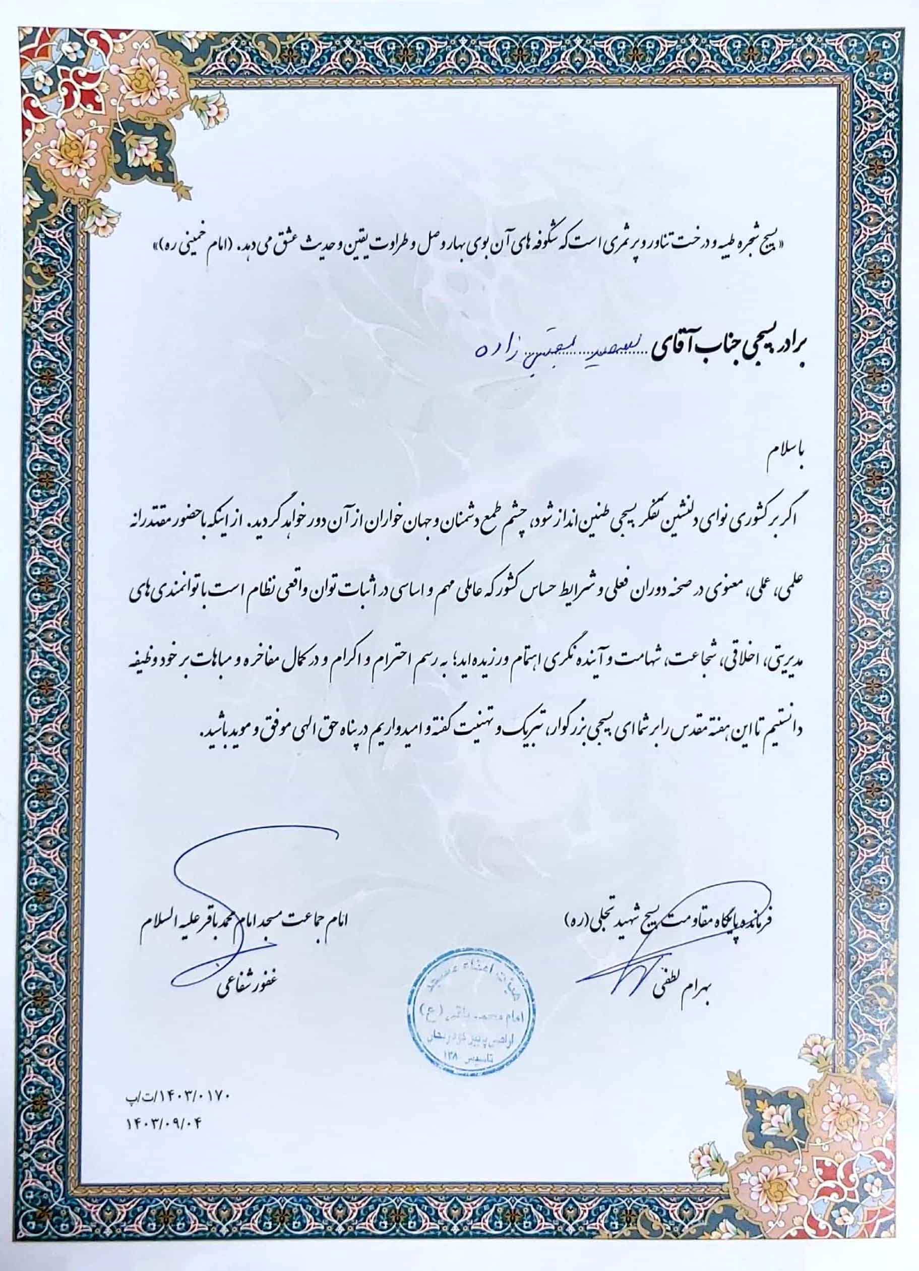 با تشکر فراوان از زحمات و محبتهای دوستان عزیزم در مجموعه بسیج مساجد و محلات و هیأت امنای مسجد امام محمد باقر (ع).