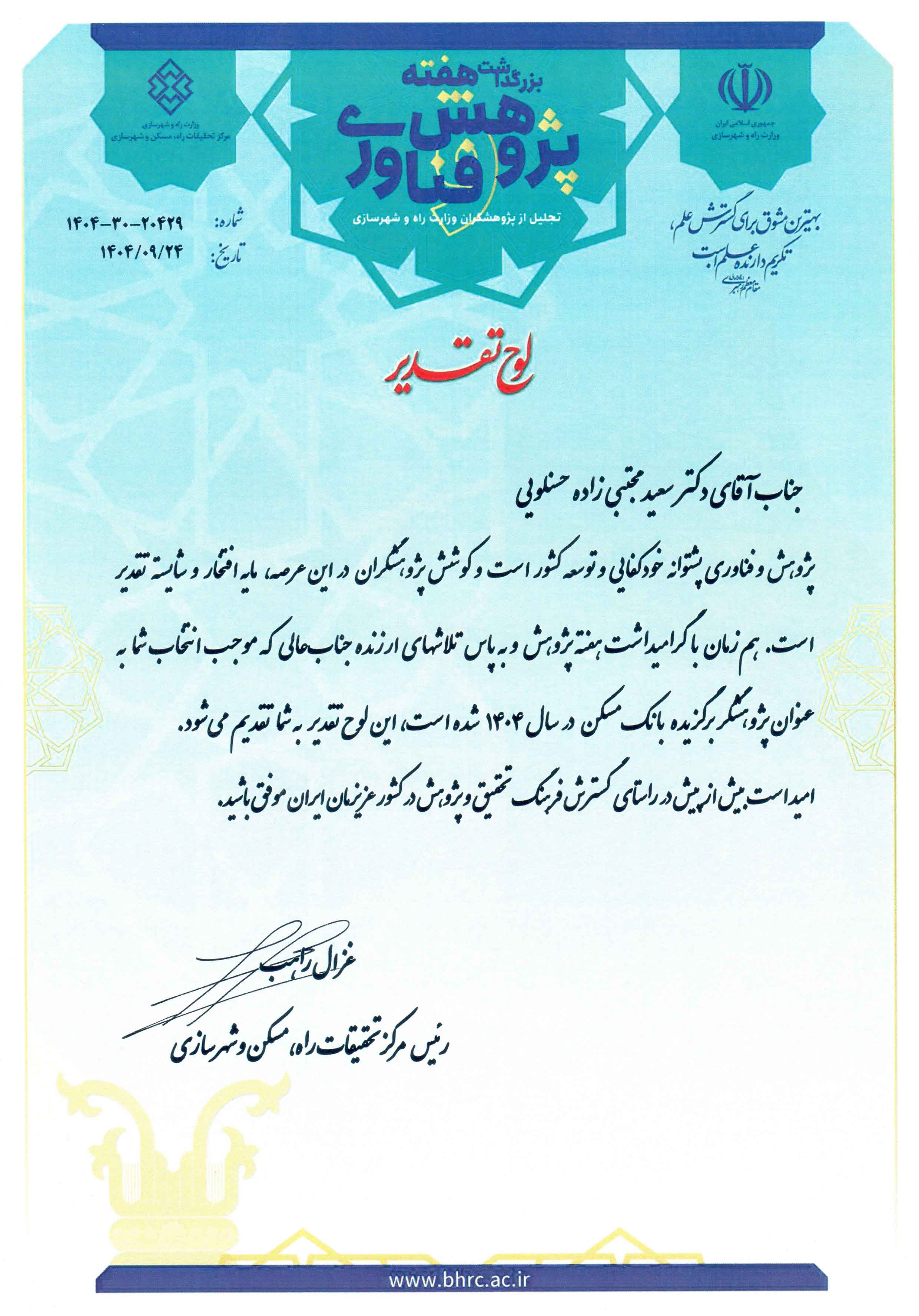 مفتخر به پژوهشگر برگزیده کشوری از سوی وزارت راه و شهرسازی، با محوریت سرمایه گذاری در تولید با پشتوانه پژوهش و فناوری.
